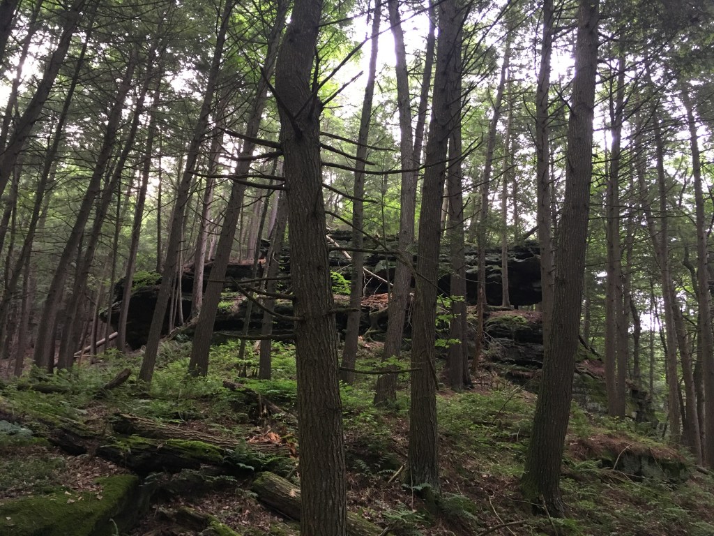 Pan Hollow Uplands: This site, owned and managed by The Nature Conservancy, is part of an extensive forest preserve extending across a wide stream valley to uplands on either side. The current Pan Hollow Uplands banding site was established in 2022, and is on the top and south slope of a quartzite bluff above a quartzite outcropping. Oaks, hickories, and maples are common in the overstory, and the midstory has become dense due to regeneration of maples and other shade-intolerant species. The ground layer is predominantly leaf-litter and maple seedlings with some shrub growth near tree-fall gaps and one remnant oak opening. The most abundant birds encountered are Wood Thrush, Ovenbird, and Veery, and 21 bird species have been banded.