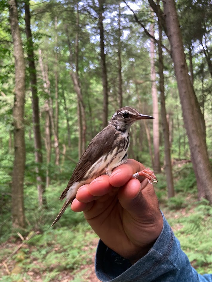 Pine Hollow: This site was established in 2021 within a stream gorge forest characterized by hemlock, sugar maple, white pine, and basswood. This is a unique site in that our nets are located along a stream and so are ideal for studying Louisiana Waterthrush populations. This has been consistently the most abundant species at this site, followed by Acadian Flycatcher. Only 13 species have been banded at this more specialized site, but several are species of high conservation concern in this landscape.